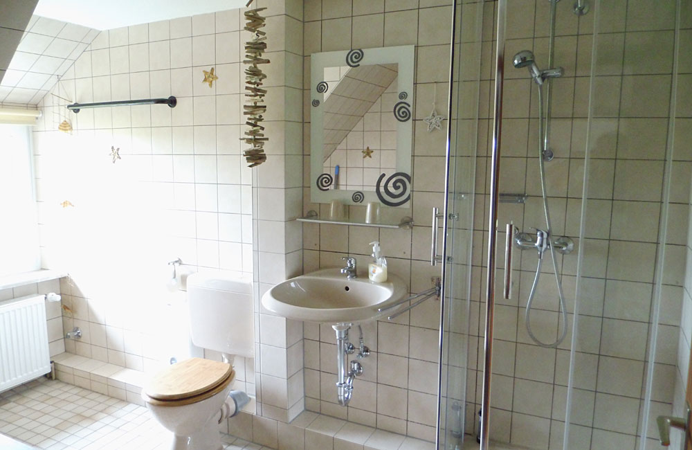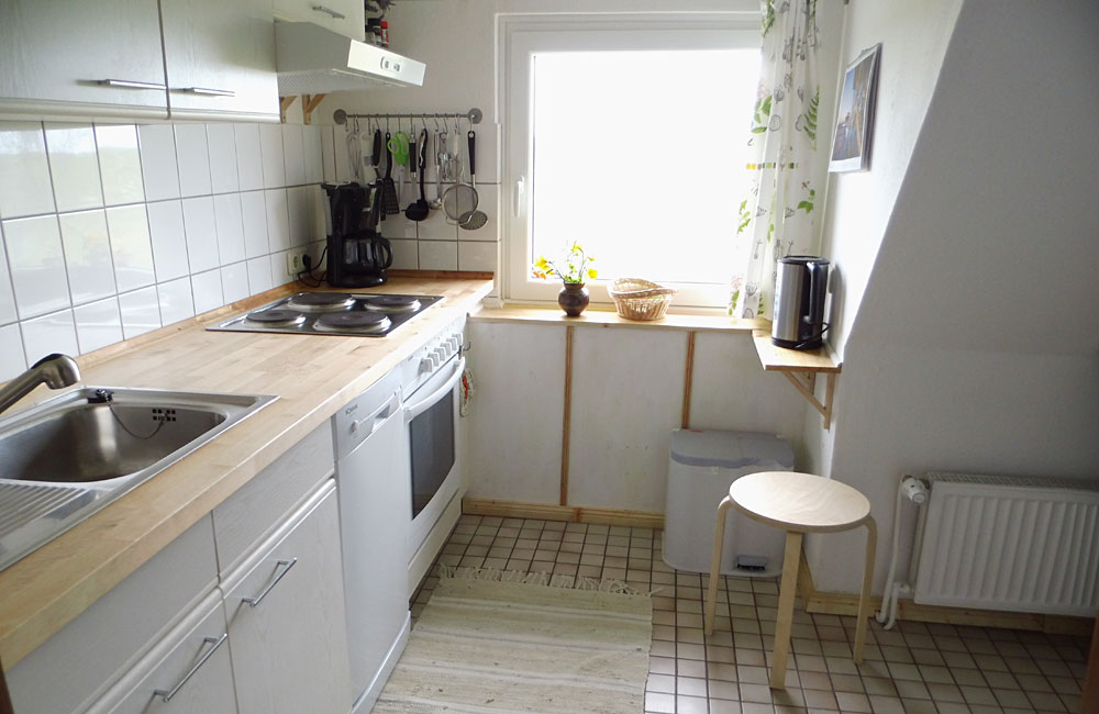- Wohnzimmer, Essecke, Küche (komplett mit Geschirrspüler, Herd etc. zur Selbstversorgung ausgestattet) und Bad