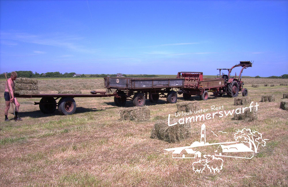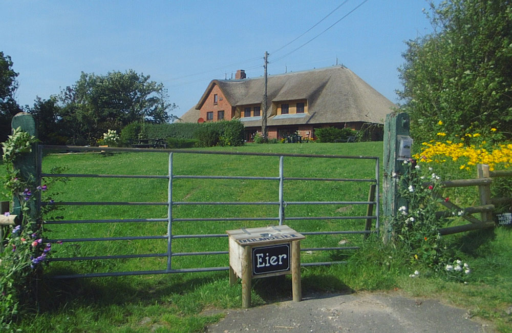 Unser Bauernhof liegt ca. 150m von der Warft entfernt, wo wir Milchkühe halten,eine Rinder- und Schafweidemast und eine Shorthornzucht (Mutterkuhhaltung) betreiben. Unsere Tiere fressen salzhaltiges Gras, was das Fleisch besonders schmackhaft macht. Die Schafe dienen auch zum Schutz des Deiches, da sie alz einzige Tiere die Grasnarbe kurz halten ohne die Wurzeln zu beschädigen und die Deichkrone festtreten, damit die Flut nicht den Boden wegspülen kann.
